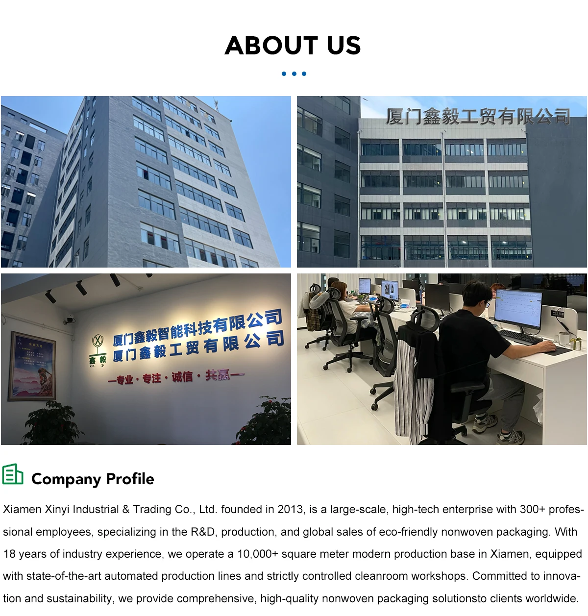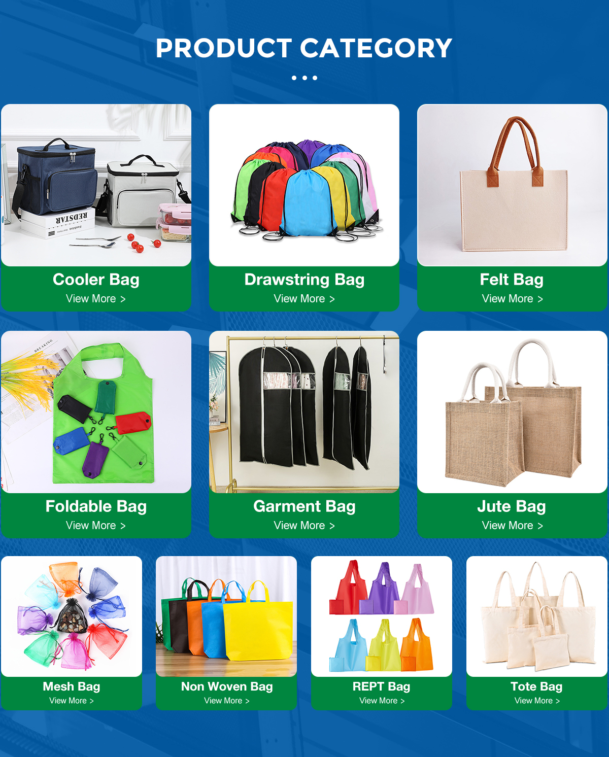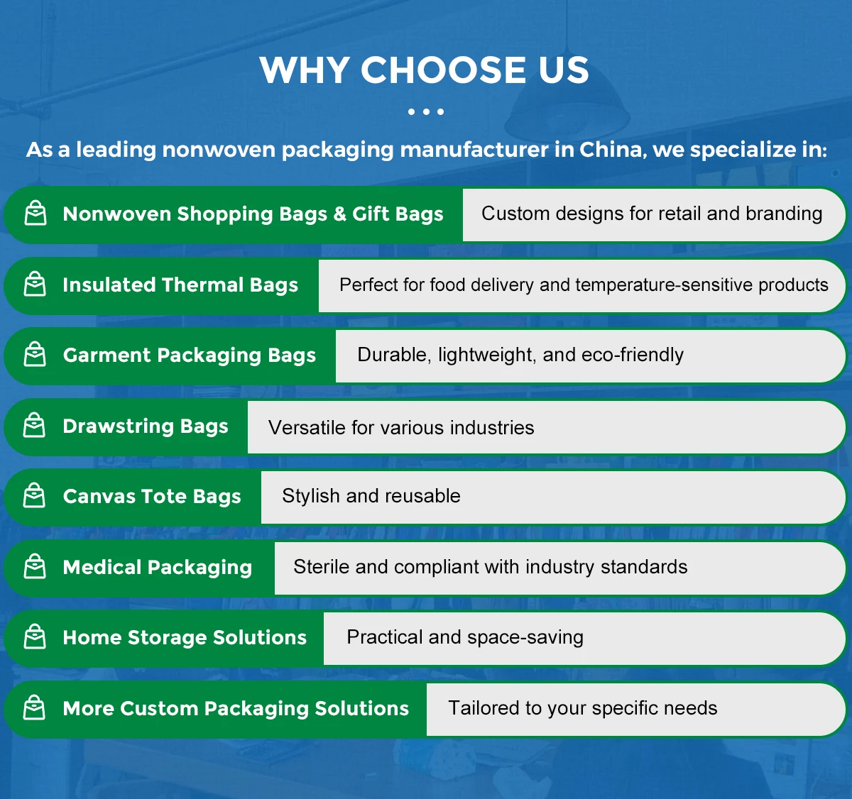 Productos principales:Bolsas de la compra, bolsas no tejidas, bolsas con cordón, bolsas de lona, bolsas RPET